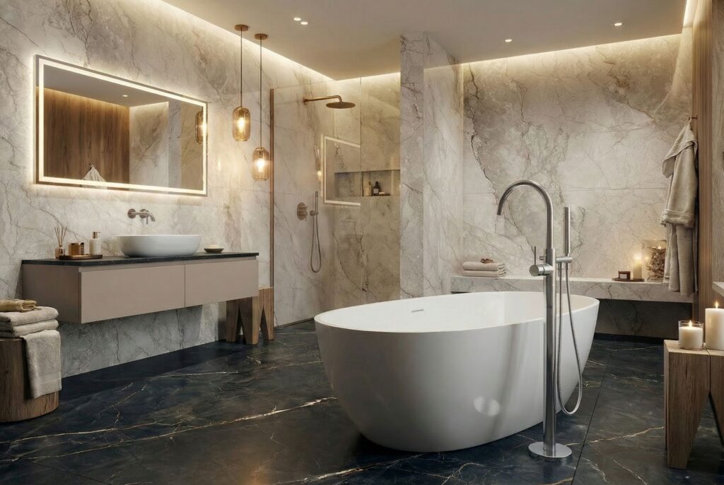 Układ został zaprojektowany od podstaw – instalacje dopasowano pod wannę wolnostojącą i baterię podłogową. Pozwoliło to uzyskać czystą, elegancką formę bez kompromisów. Kolorystyka oparta na szarościach i czerni została ocieplona drewnem oraz światłem, które buduje atmosferę relaksu. Strefa przy wannie pełni funkcję wypoczynkową, a całość tworzy spójne, spokojne wnętrze premium.